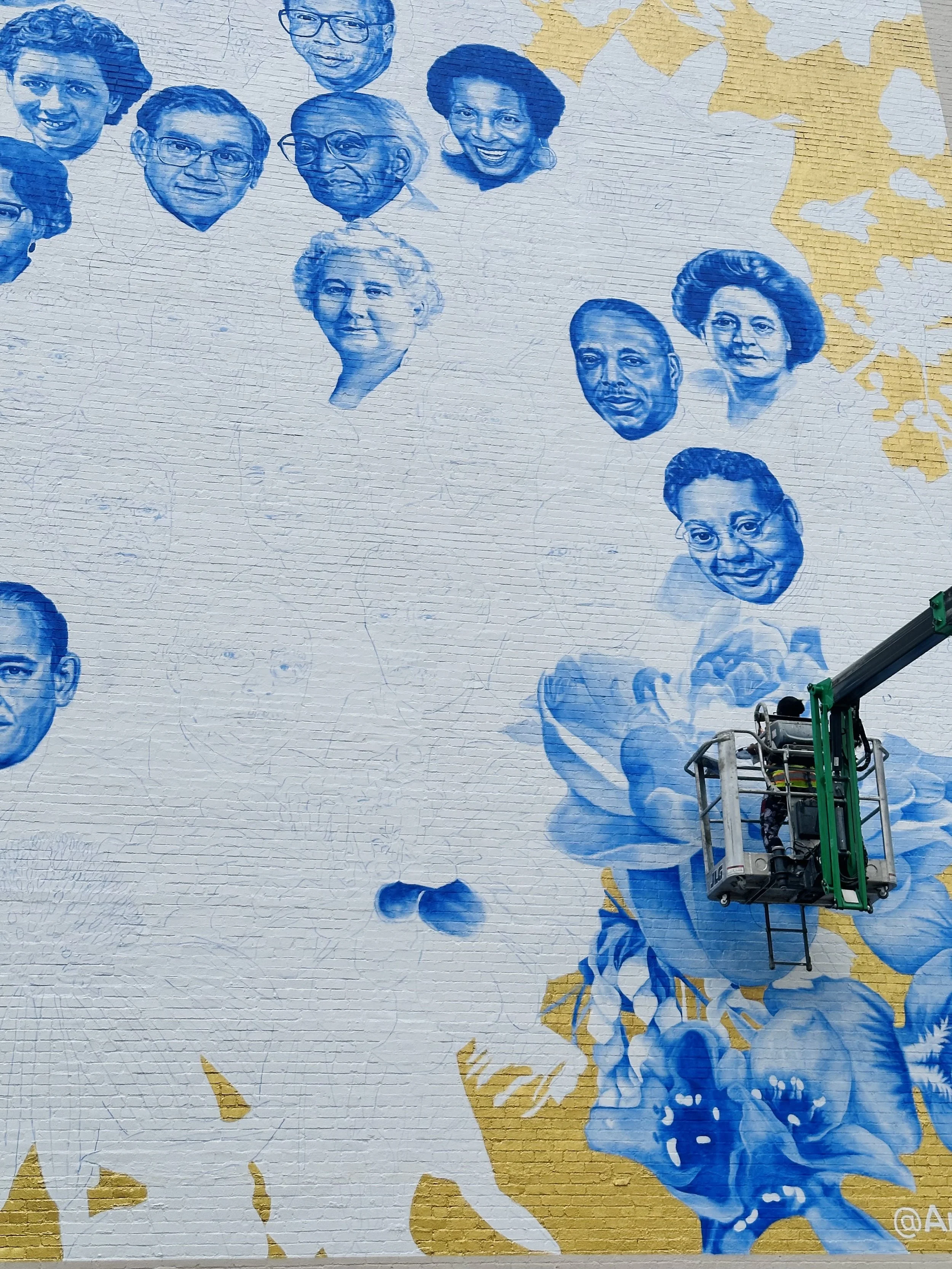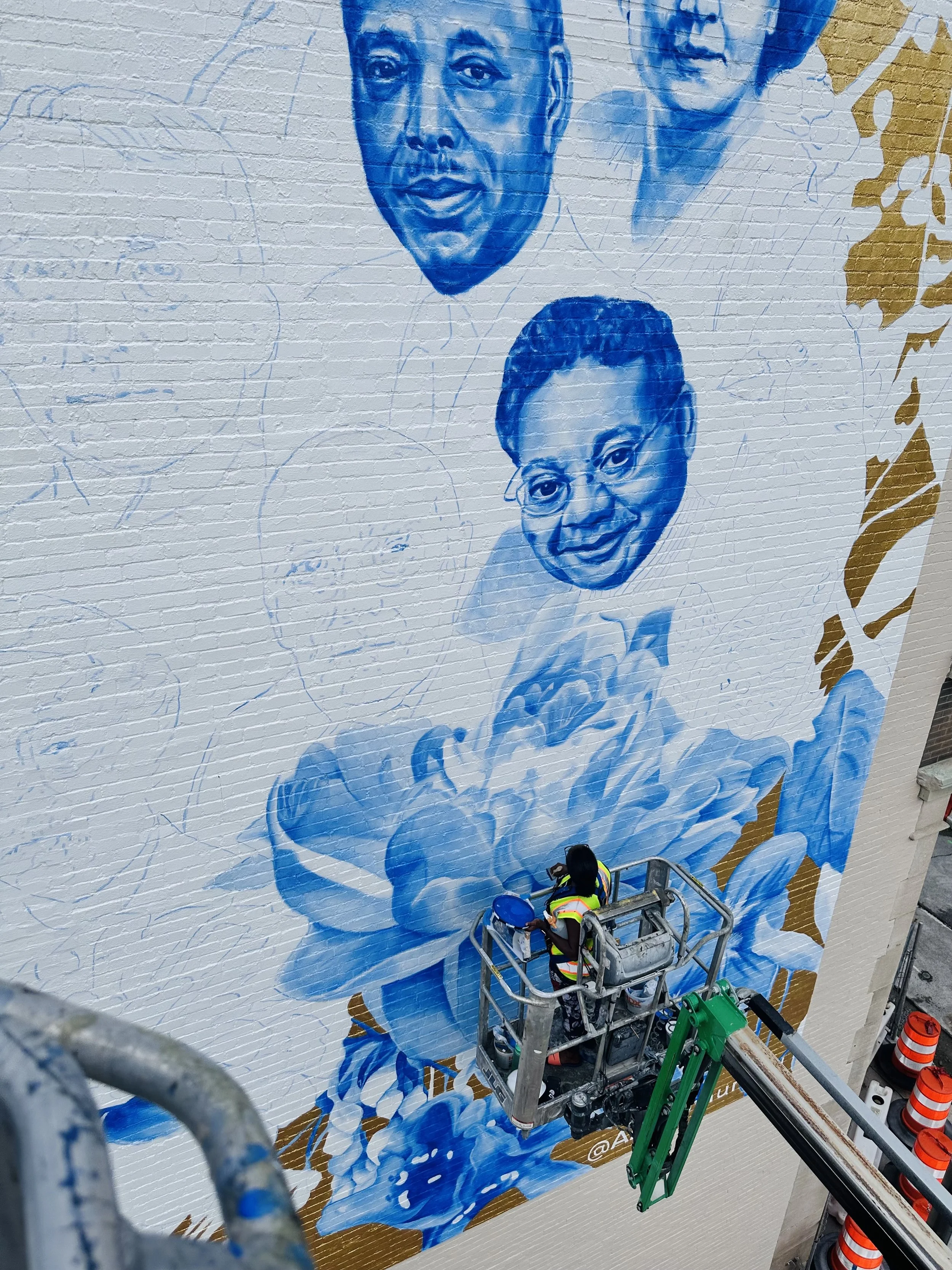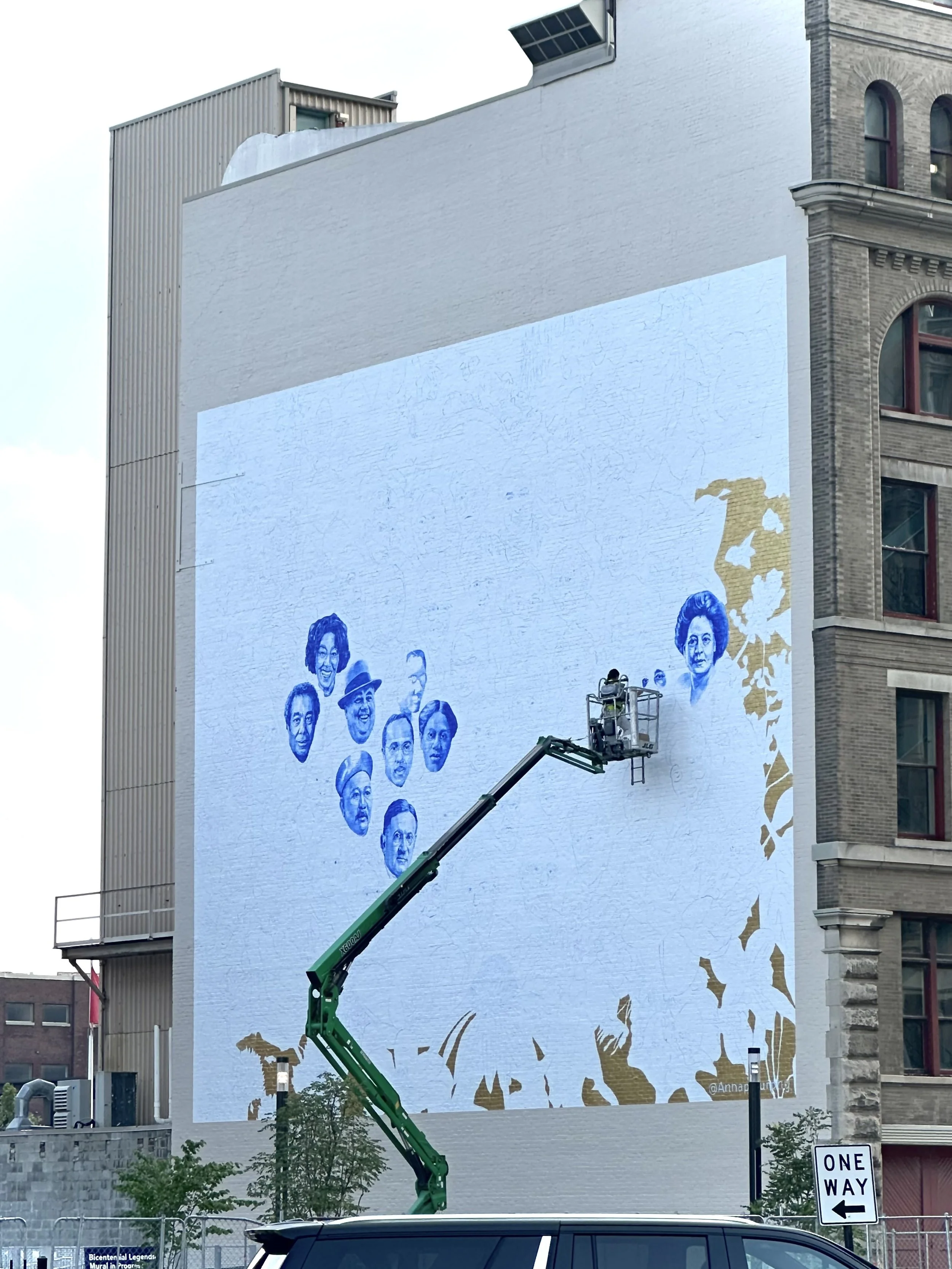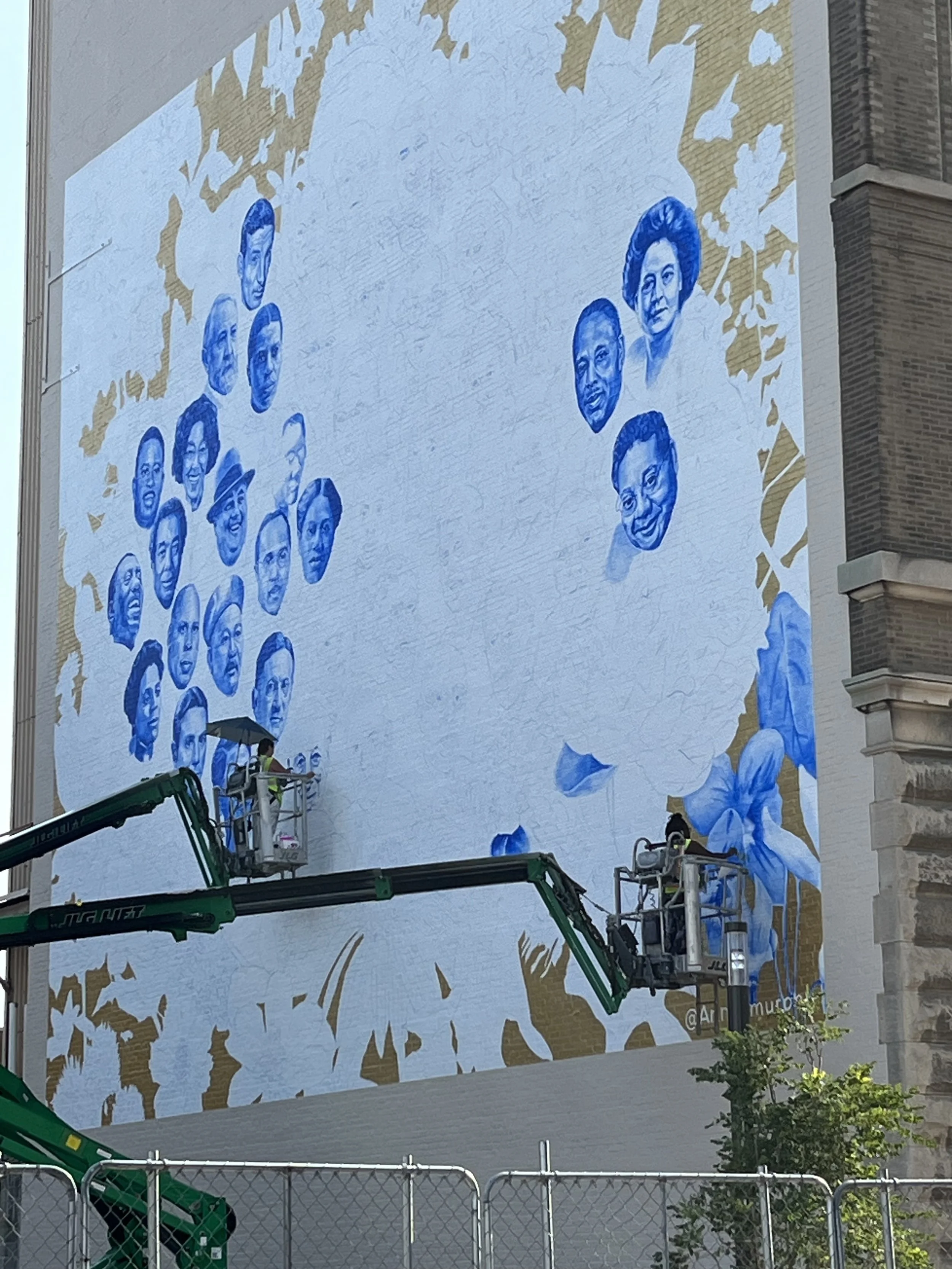 In 2023, I assisted Chicago based artist and muralist, Anna Murphy, on a large scale mural located downtown Indianapolis on the Steak N Shake Headquarters at Morris Bicentennial Plaza. The mural was the final installation for the Bicentennial Legends mural project. This particular mural features 44 Hoosiers who made a significant impact within the state of Indiana. The design included portraits as well as birds and flowers that paid homage to the roots of the legends’ hometown.