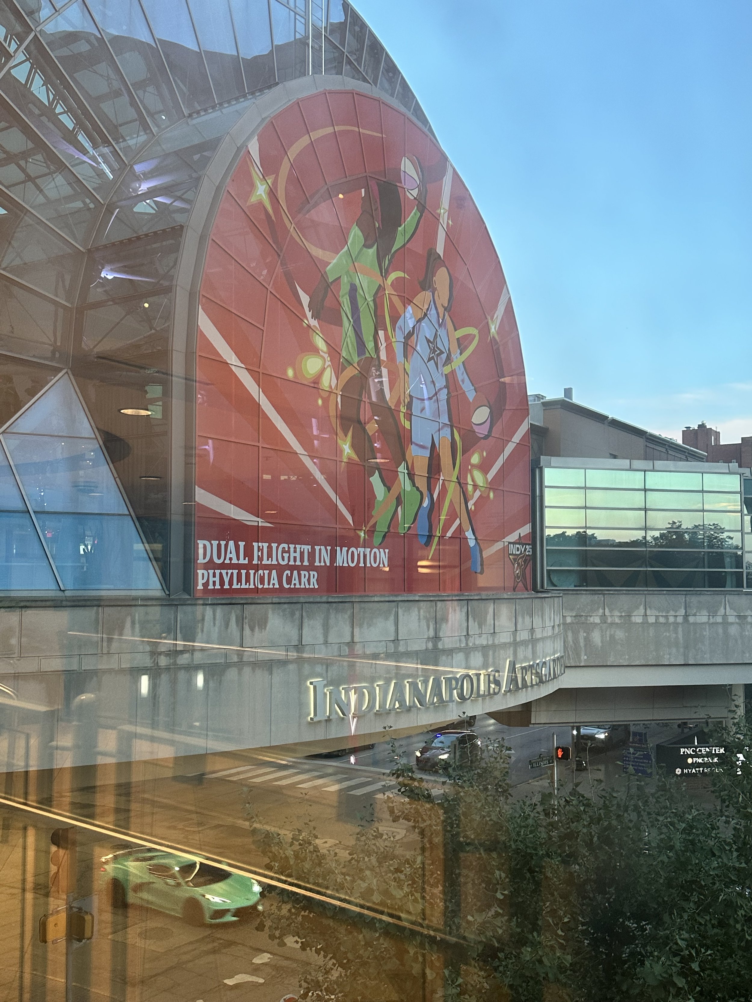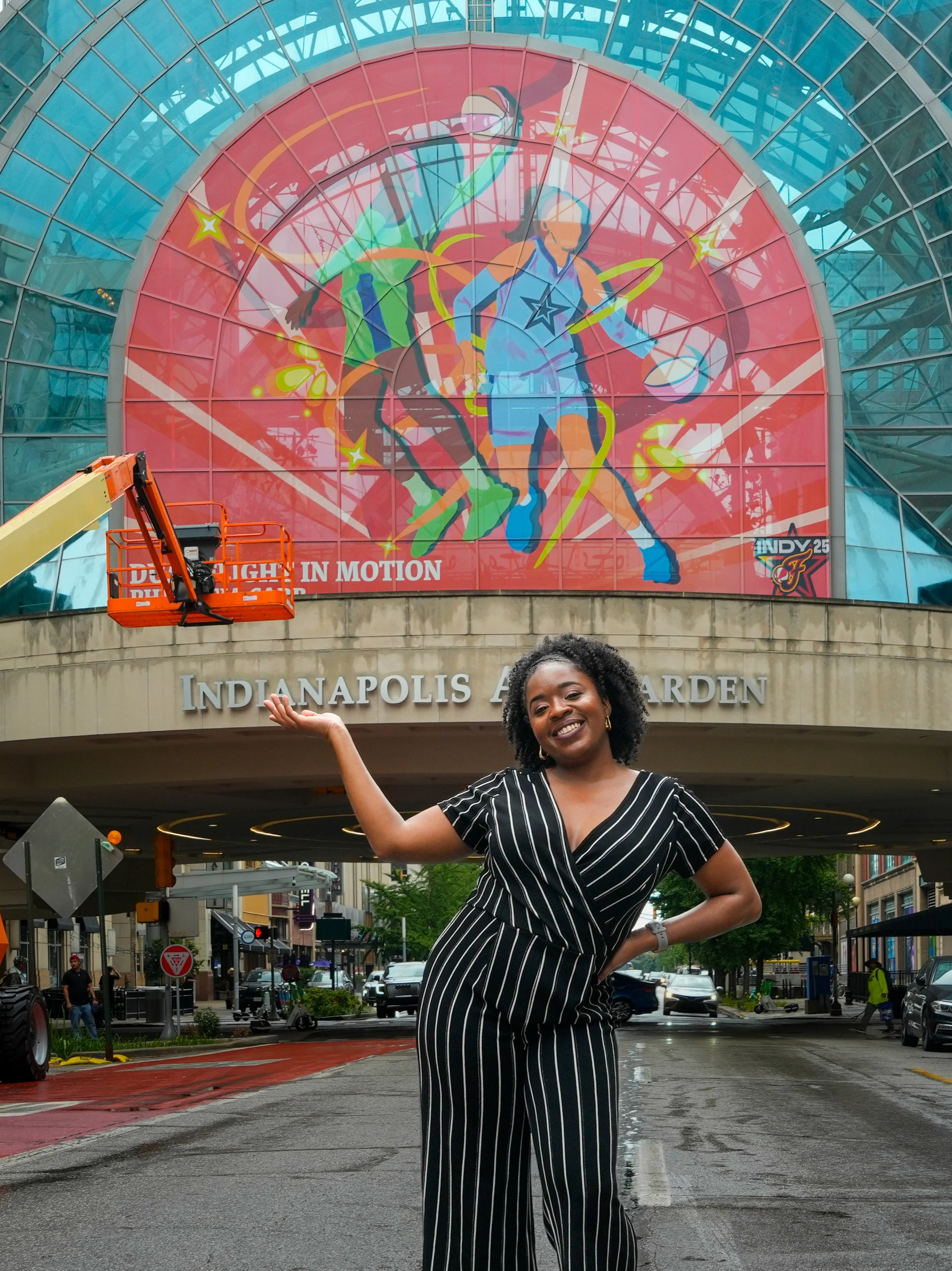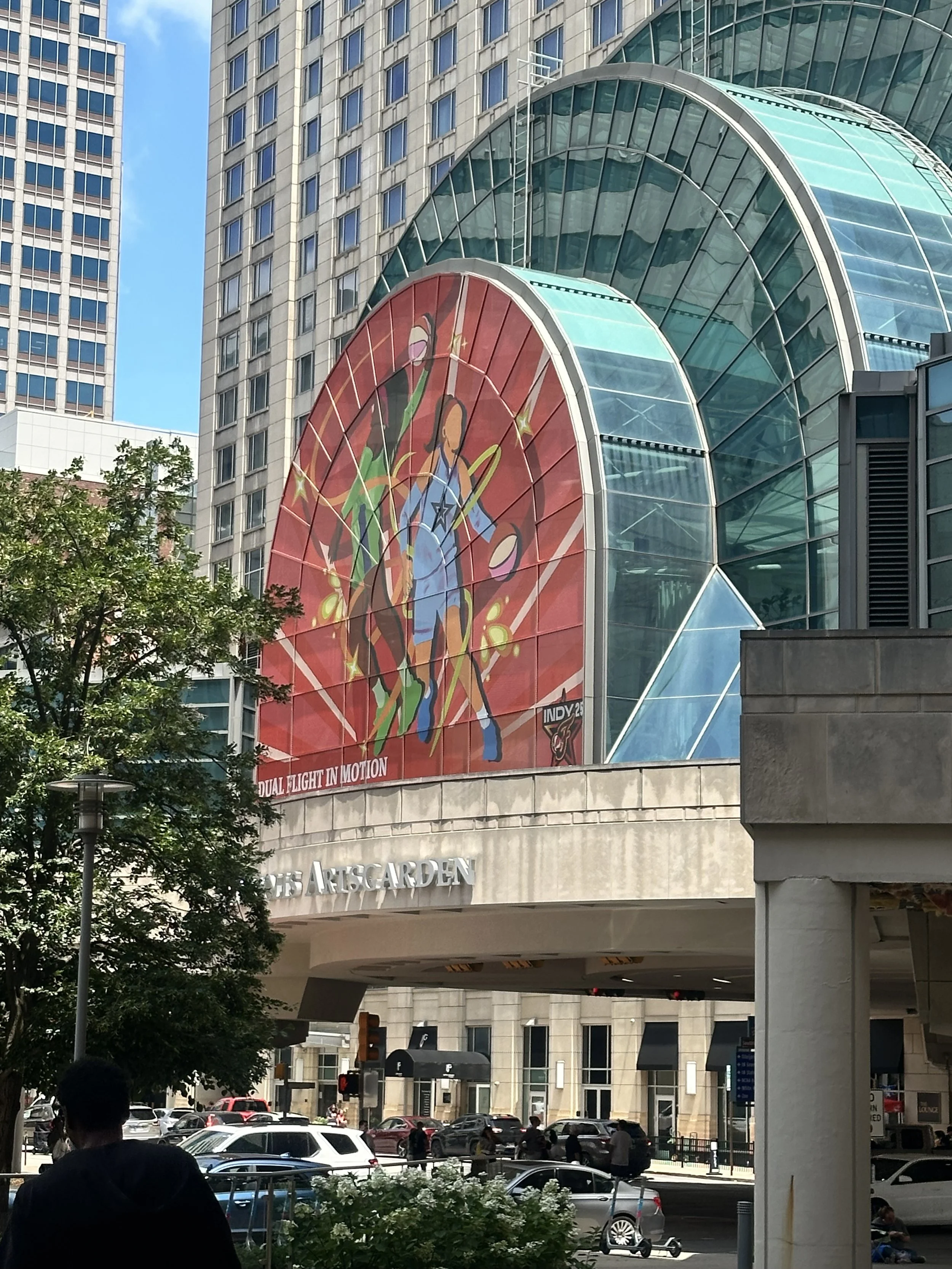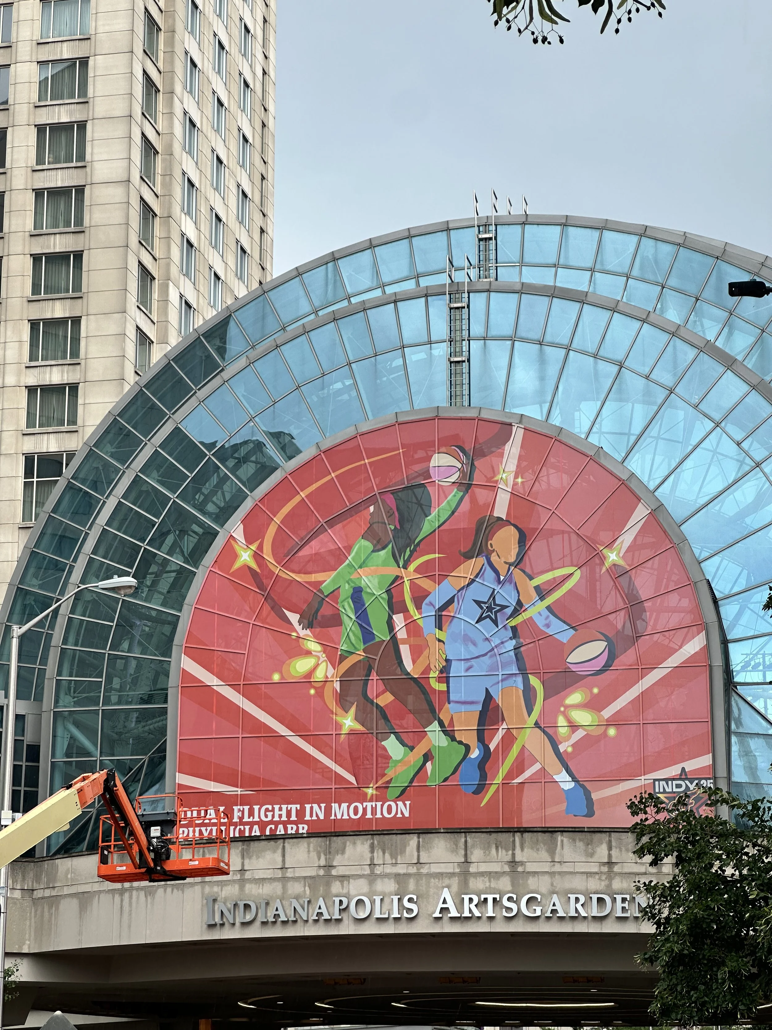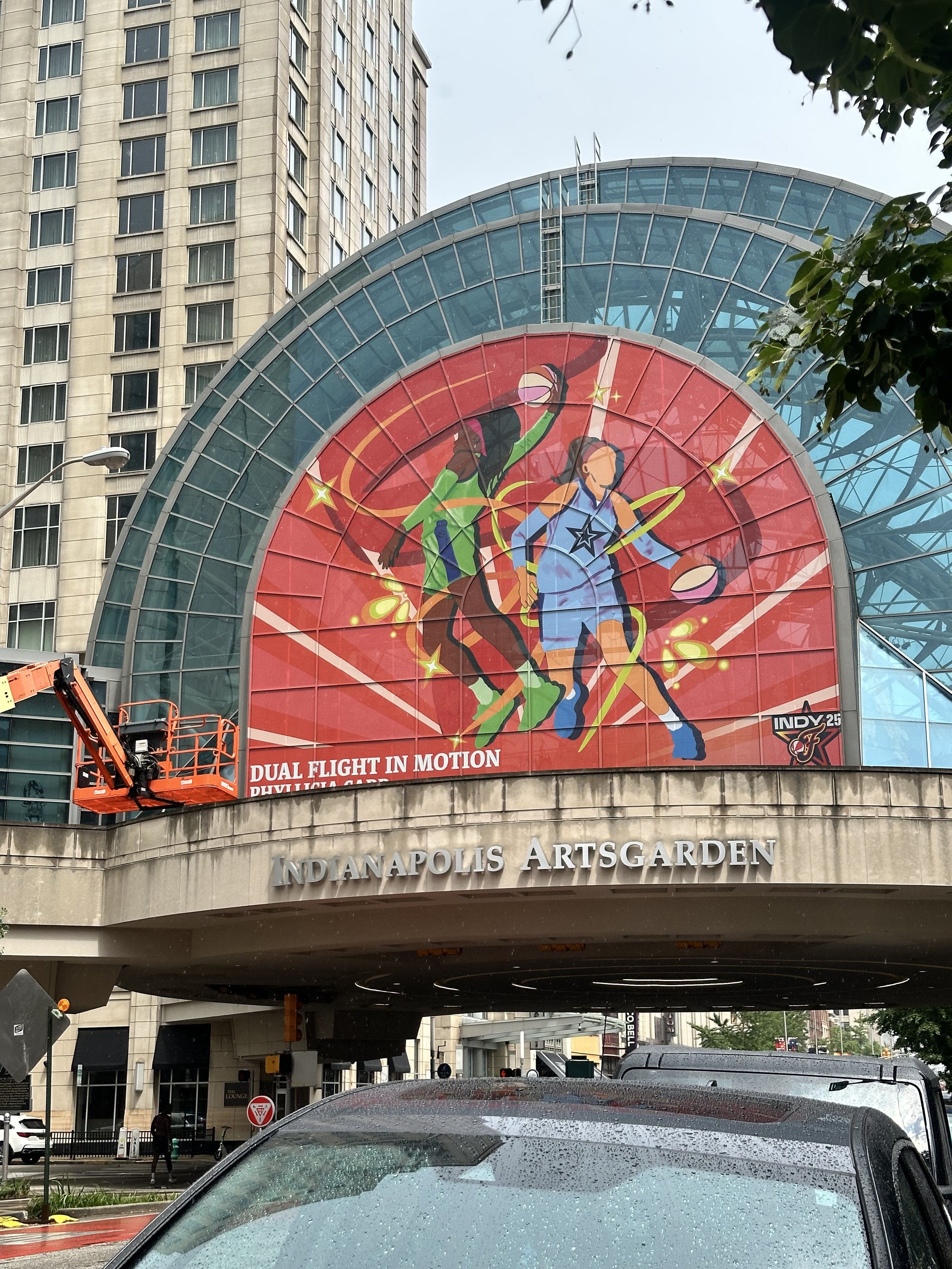 Dual Flight in Motion was one of two murals featured on the Indianapolis Arts Garden facade during the 2025 WNBA All Star weekend. This mural celebrates diversity, unity, and the shared strength found in different stories coming together on the same court. The two women facing opposite directions symbolizes unique perspectives that move in harmony toward a common goal. The colors are fiery and warm reds, oranges, yellows — pulling from the “Red Hot Summer” theme but also with respect to the passion and drive that lives in every athlete.