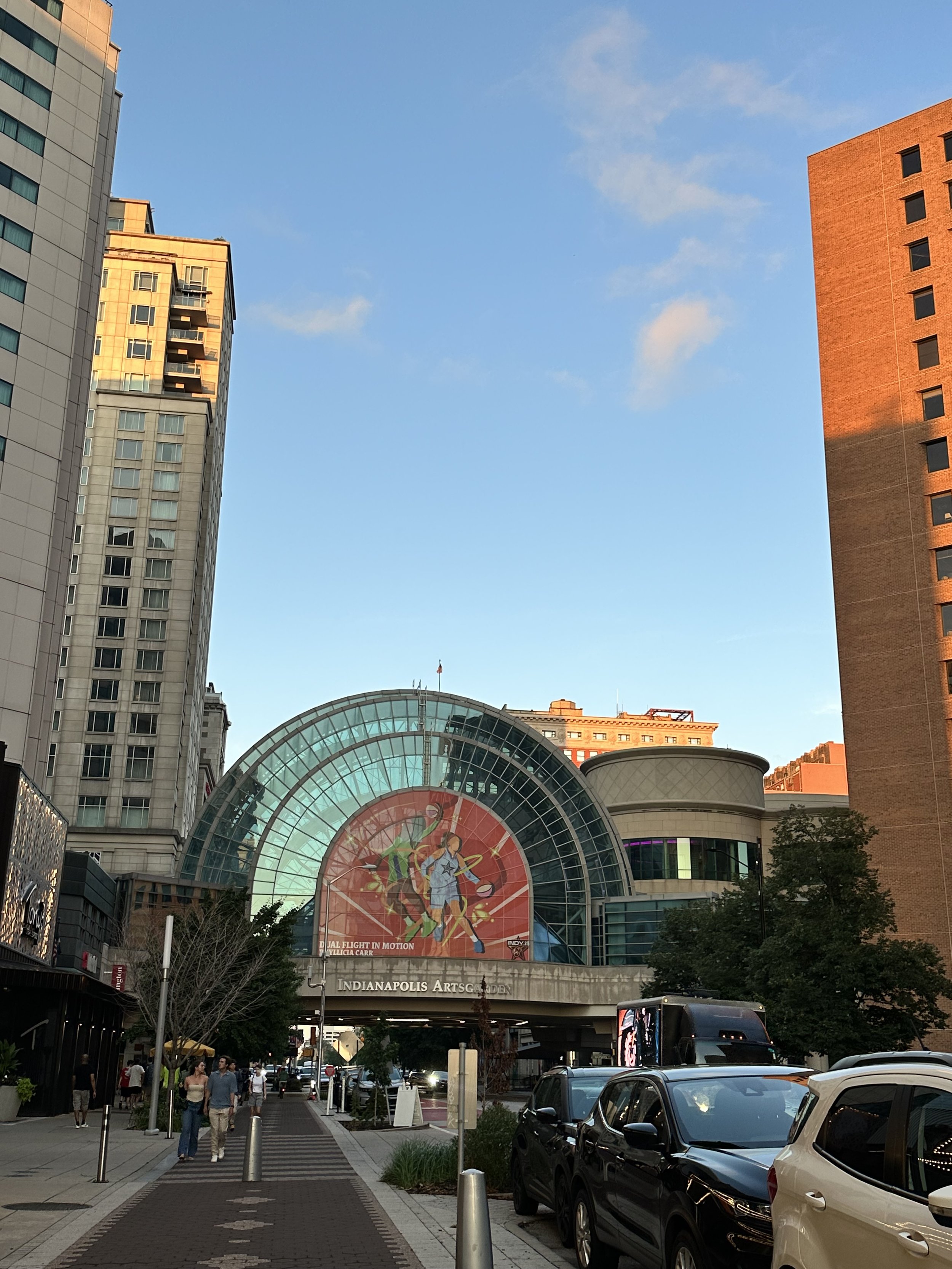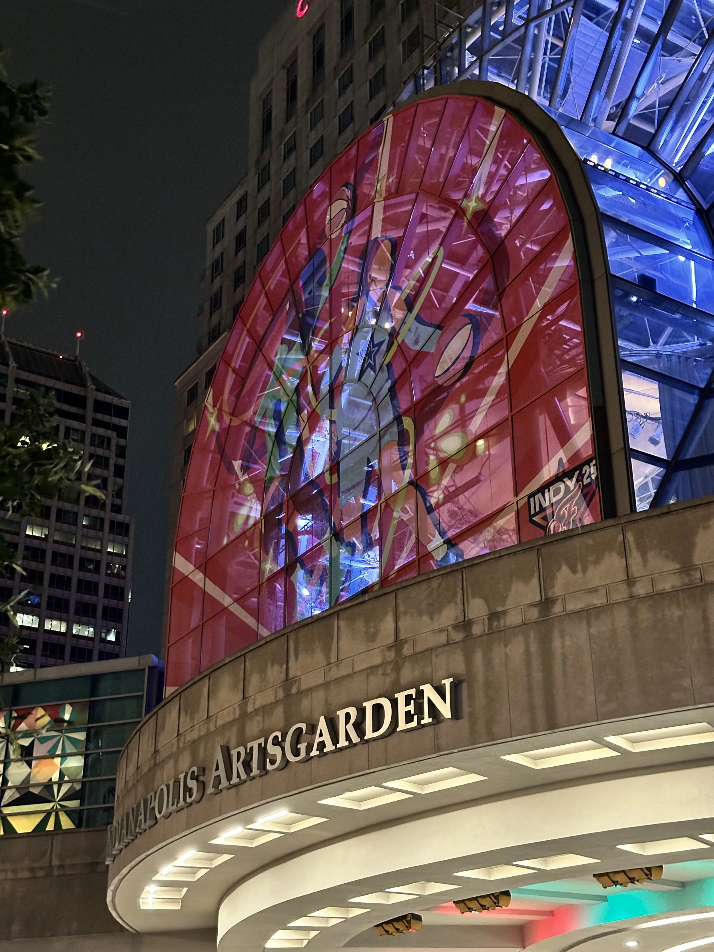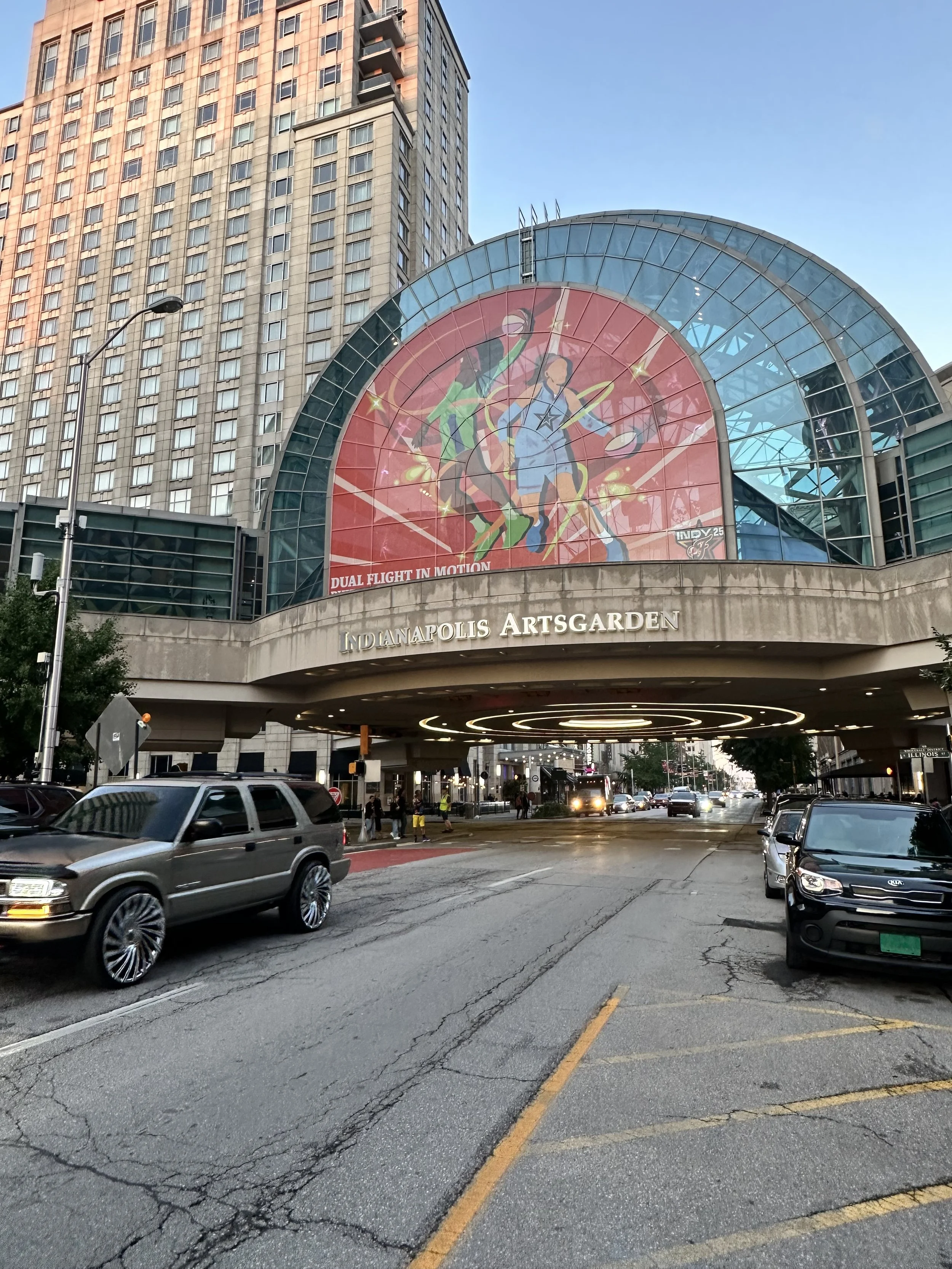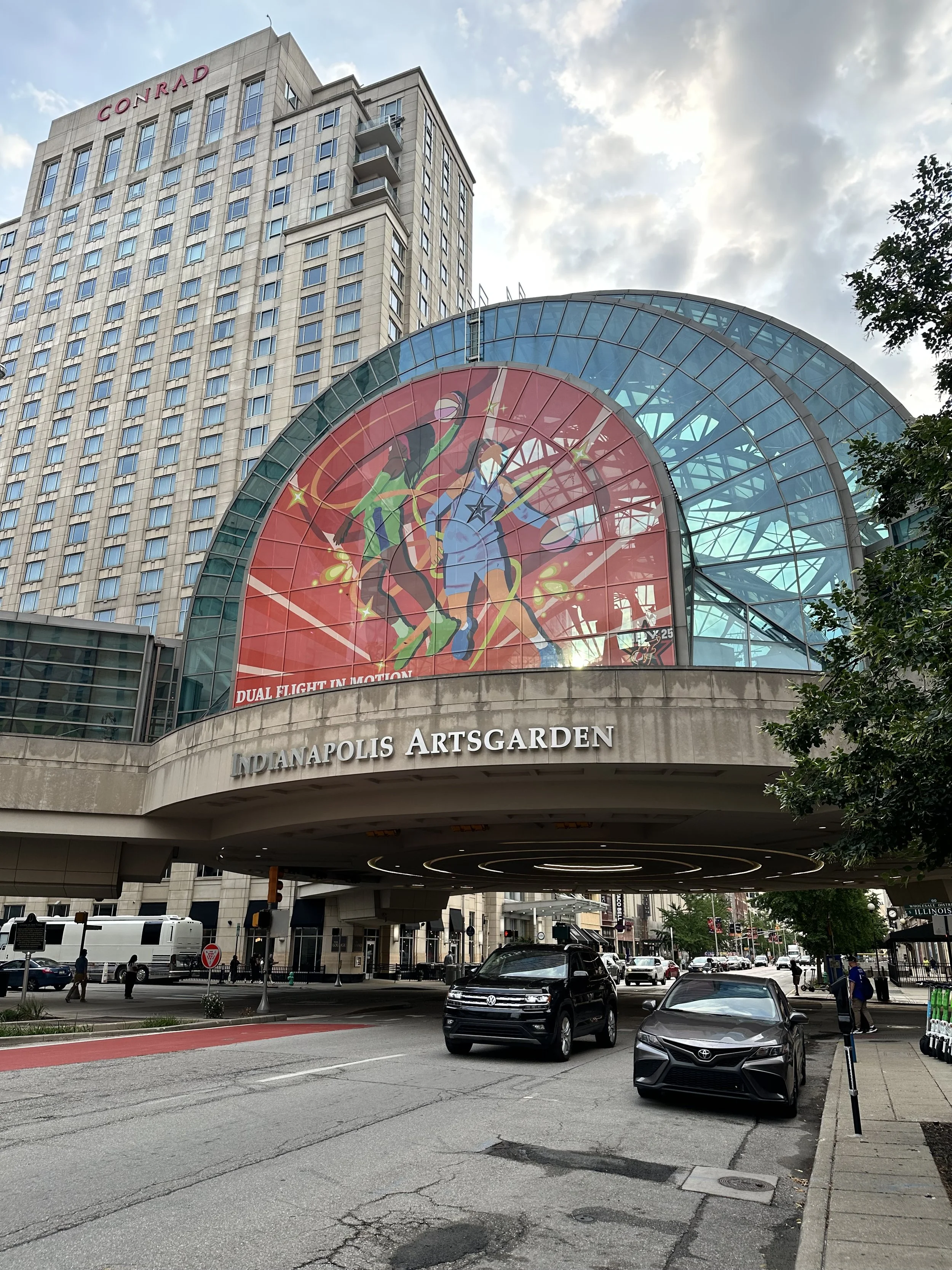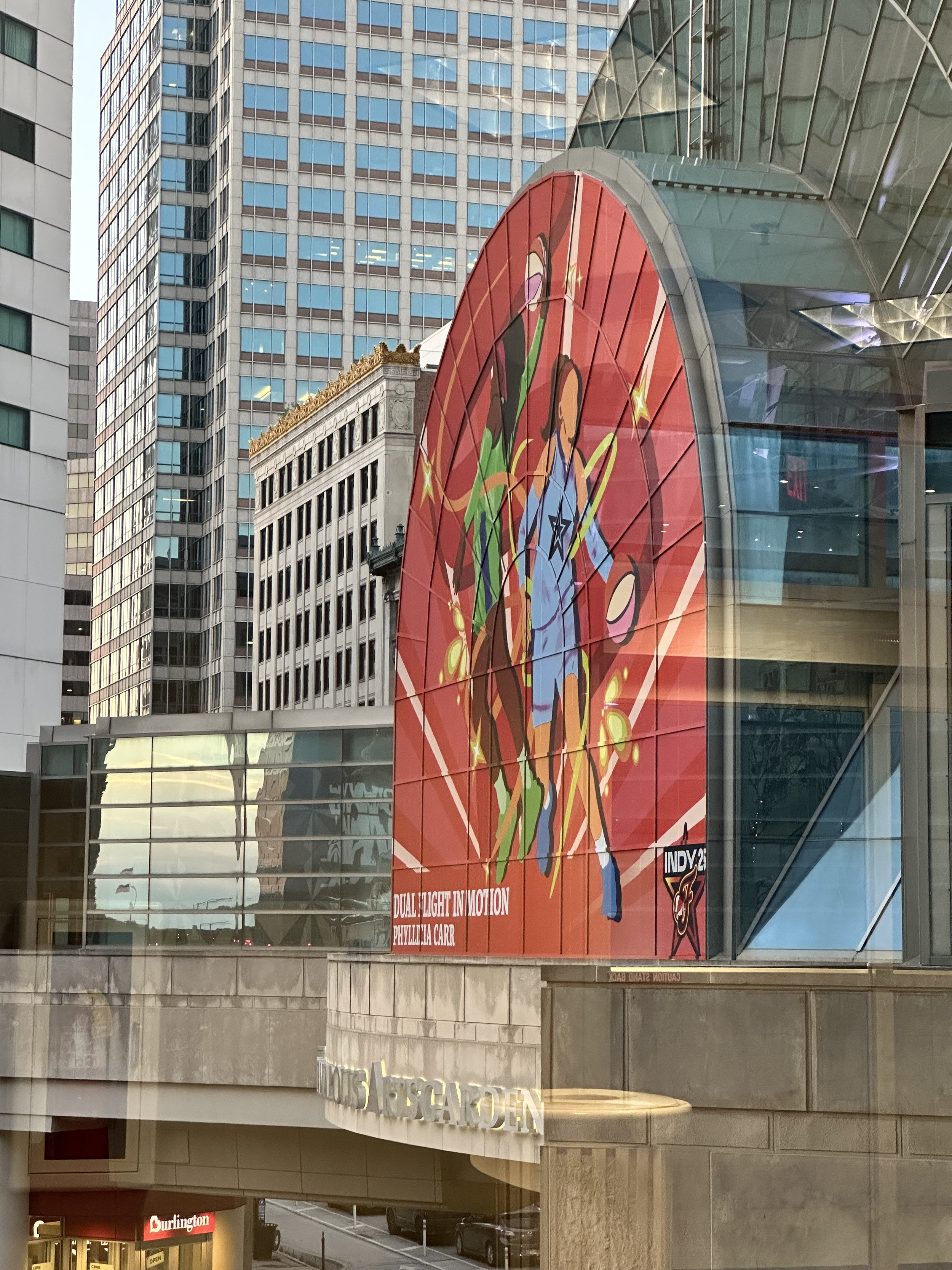 Dual Flight in Motion was one of two murals featured on the Indianapolis Arts Garden facade during the 2025 WNBA All Star weekend. This mural celebrates diversity, unity, and the shared strength found in different stories coming together on the same court. The two women facing opposite directions symbolizes unique perspectives that move in harmony toward a common goal. The colors are fiery and warm reds, oranges, yellows — pulling from the “Red Hot Summer” theme but also with respect to the passion and drive that lives in every athlete.